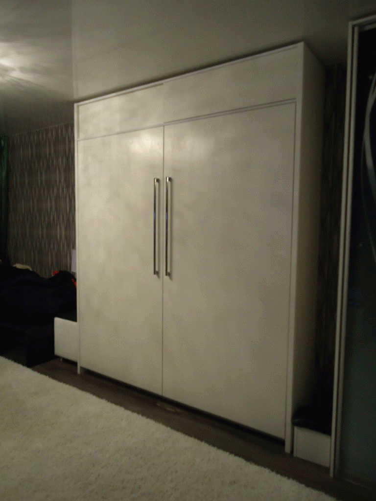 Кровать-шкаф, по внешнему виду, в сложенном состоянии, полностью соответствует внешнему виду шкафа с красивыми и стильными фасадами, в выбранной цветовой гамме. Кровать, спрятанная в гардеробном шкафу, станет отличным запасным спальным местом в Вашей квартире, создаст оптимальные условия для сна и свободы. Шкаф с кроватью незаменим для малогабаритных квартир и комнат.